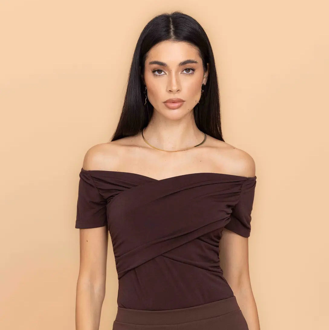 Off-the-shoulder midi bodycon dress.