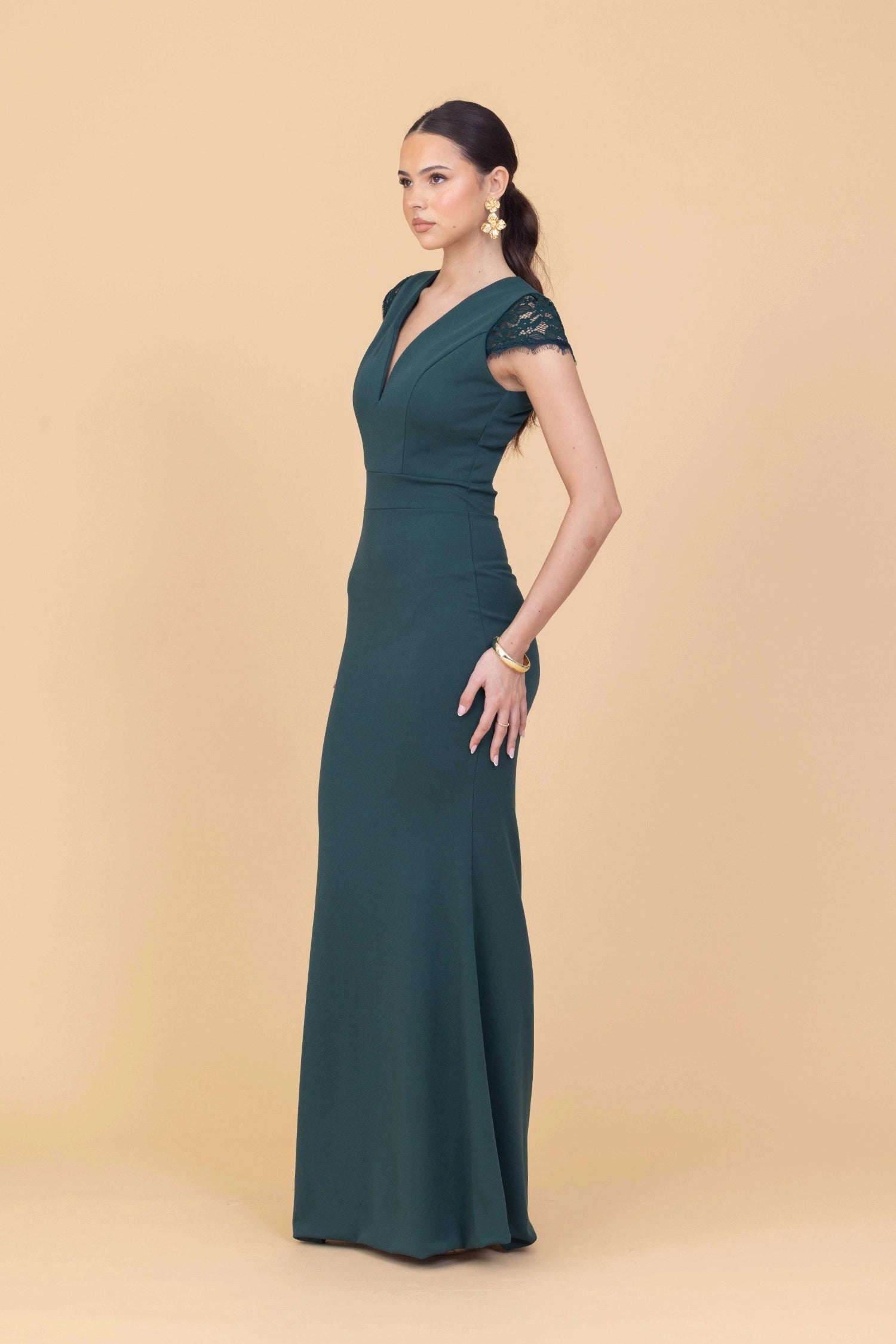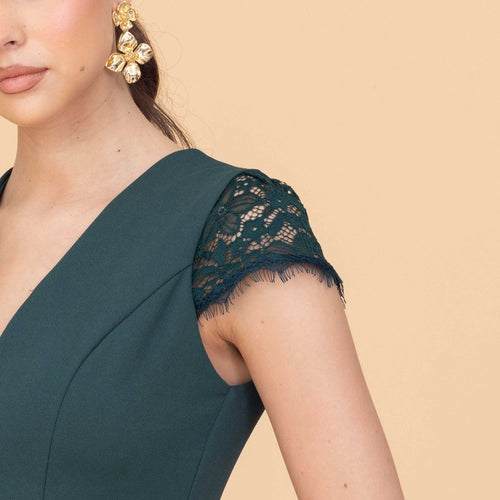Das SAMMY Forest Green Maxi Dress Tall ist mit einem taillierten Oberteil gefertigt, das in eine schmeichelhafte Meerjungfrauen-Silhouette übergeht. Elegante Flügelärmel aus Spitze umrahmen die Schultern, während der V-Ausschnitt für einen Hauch von Weichheit und Raffinesse sorgt. Der tiefe Waldgrünton unterstreicht seinen zeitlosen Reiz und macht dieses Maxikleid zu einer herausragenden Wahl für besondere Anlässe. Das Kleid soll einen bleibenden Eindruck hinterlassen und verfügt über einen anmutigen, bodenlangen Rock, der sich bei jedem Schritt mühelos bewegt. Halten Sie das Styling mit dezenten Accessoires minimalistisch, damit die aufwendige Spitze und die satten Farben im Mittelpunkt stehen.