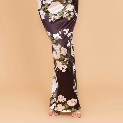 The ABIGAIL floral high neck maxi dress in dark chocolate satin is all about its deep brown shade, smooth and glossy like melted cocoa. The halterneck sits high, leaving your shoulders and back open, before the waist pulls inward, holding your figure. The skirt flows long and fluid to the floor, the richness of the dark chocolate satin enhancing the blooms of green and white. For a lighter look, consider our green halter neck floral maxi dress version of ABIGAIL in luxe khaki.