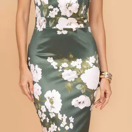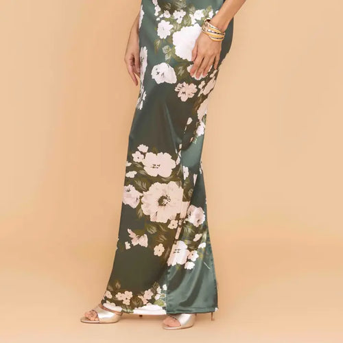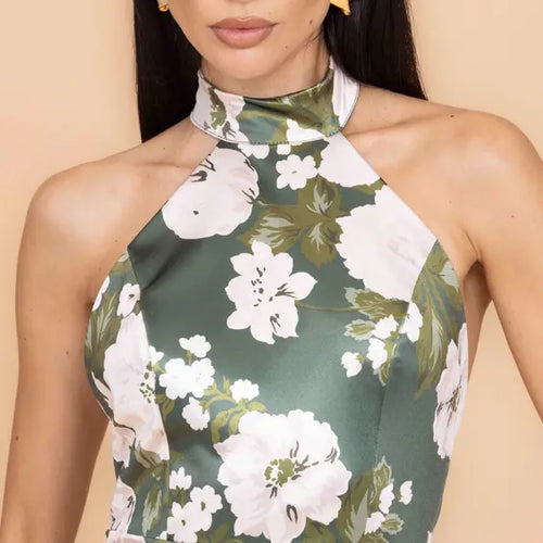 The ABIGAIL Halterneck Maxi Dress is patterned with rich and luscious white flowers framed by sprawling green leaves. The halterneck sits high, leaving the shoulders bare while the back falls away completely. The cut of this maxi dress shapes the body gently at the waist before the fabric falls smoothly into a floor-length skirt, the floral print satin perfect for catching early evening light. Why not change the tone and consider our brown floral high-neck maxi dress version of ABIGAIL in deep chocolate?