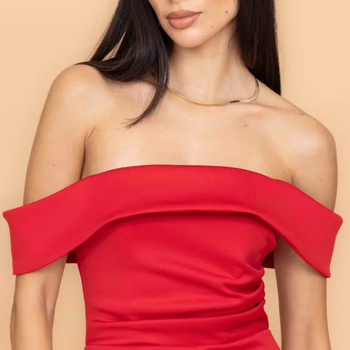 The epitome of timeless elegance, ALEX combines a folded Bardot neckline with a figure-skimming gown in a striking red hue. The neckline traces a gentle arc across the décolletage and upper arms, creating a bare canvas for your favorite bejeweled necklace. With its structured fabric and mermaid cut, this off-shoulder occasion dress is designed to leave a lasting impression at black-tie soirées and formal dinners.
