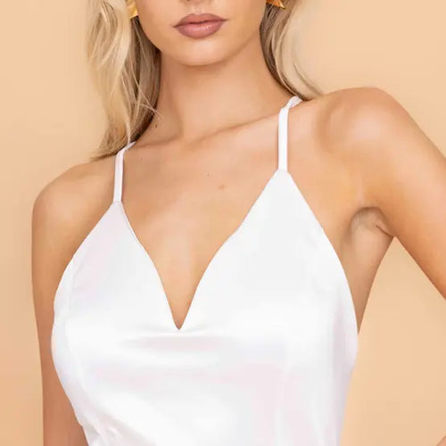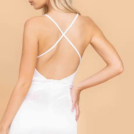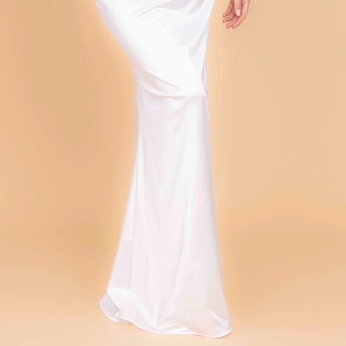 The ALLY, a V-neck backless wedding dress cut in glossy satin, her surface smooth and reflective, gathering and sharing light across its floor-length drape. An effortlessly glamorous silhouette, the sculpted V-neck bodice is held by impossibly slender straps which cross and delicately frame the low open back. The waist of this maxi dress pulls inward before the fabric flows, curving around the body and flaring at the floor, pure and straightforward elegance.