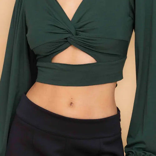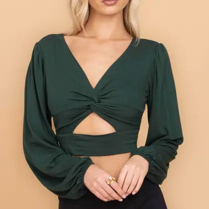 The ANGELINA Forest Green Top is defined by its open back, the tie up waistband outlining the silhouette bringing a touch of elegance. The sleeves of the top are loose and full-length, moving easily around the arms. The v neckline is gathered into a graceful knot, with the cutout beneath creating a daring contrast. This forest green, cut out, long-sleeve top is the ultimate piece to carry you from day to night with confidence. ANGELINA also comes as a red cut-out, long-sleeve top, in a sumptuous wine color.