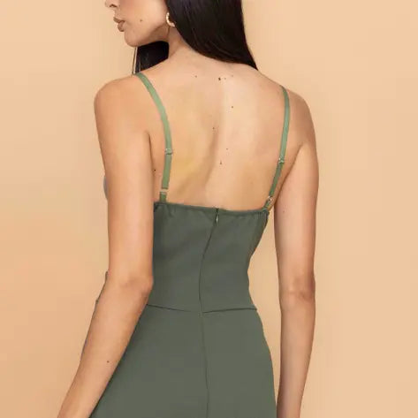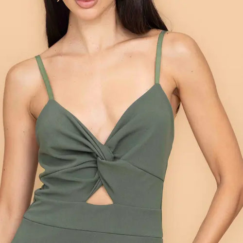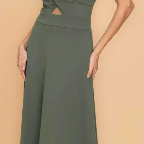 The ANNIE Dark Khaki Maxi Dress defines confidence with her sculpted waist and daring cut-out. This maxi dress captivates with its playful approach to structure and exposure. A cut-out detail reveals the skin tastefully in combination with a knotted bodice. The waist pulls close, framing the dress before the skirt extends in a full-length cascade of dark khaki. This cut-out front maxi dress also comes in navy blue in our ANNIE Blue Twist Front Dress.