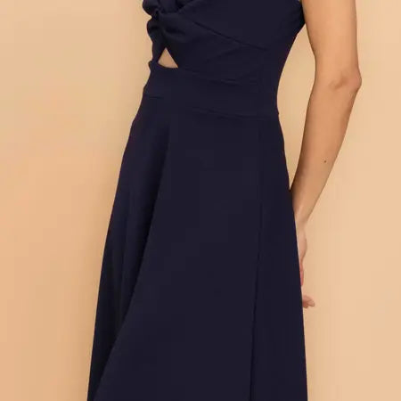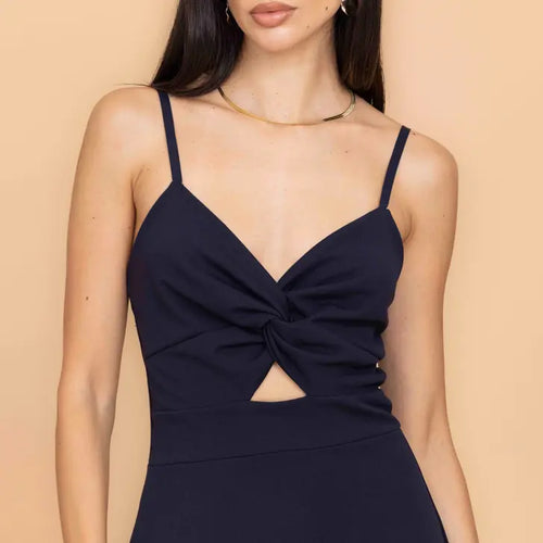 Meet ANNIE, a vision in midnight navy. She’s a maxi dress that draws the eye with a neckline that dips deeply, following the curves of the collarbone. Her delicate straps rest with impossible lightness on the shoulders, seeming to float in place. Just above the waist, a three-sided cut-out breaks the fabric’s flow, a pause that contrasts the neckline, the skirt of this dress falls full length, extending the form with an even, weighty sweep. For an earth-toned alternative, consider ANNIE as a khaki cut-out front maxi dress.