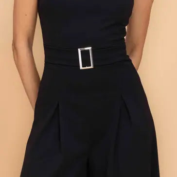 One of our most popular wide-leg jumpsuits, ASH places her focus squarely on form. A tall, rectangular buckle anchors the waist, interrupting the continuous expanse of rich, velvety black with its simple geometry. The straps are cut thick and straight, rising clean at right angles from the neckline, creating a frame for the chest and shoulders. Wide legs flatter the silhouette and amplify ASH’s presence. For a splash of color, consider our blue belted jumpsuit version of ASH in deep indigo blue.