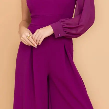 ASH is for those wanting a refined look with a touch of playful glamor. The bodice cinches at the waist with an asymmetrical neckline and a sheer balloon sleeve. With wide-leg pants that skim the body before flaring out, this jumpsuit with one sleeve is perfect for all kinds of celebrations. Designed in a deep, plum color, ASH is a jumpsuit fit for all seasons. Style with a sleek chignon and pendant earrings.