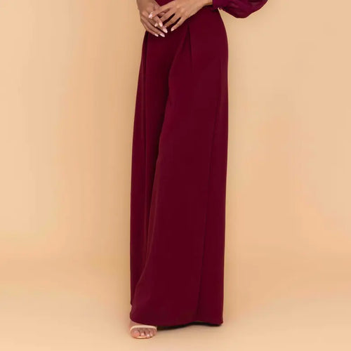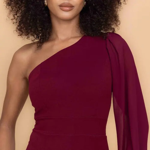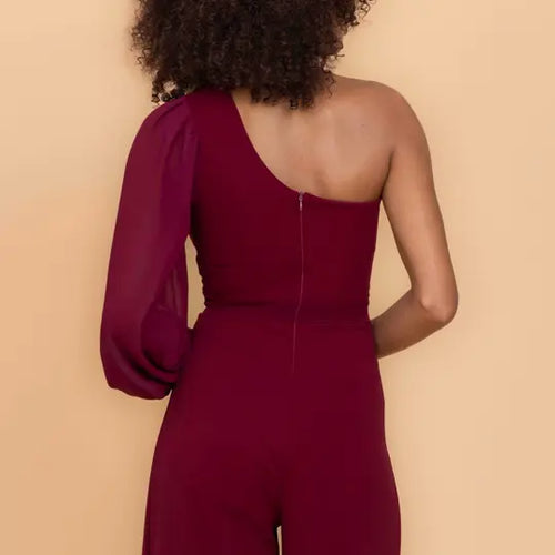 The Ash One Sleeve Jumpsuit is defined by contrast. This one-sleeve, wide-leg jumpsuit starts with a single chiffon sleeve loosely flowing down to the wrist. The opposite shoulder is bare, the neckline cut on an angle. This jumpsuit is fitted through the waist, with the legs flaring below, the result fixed and clear in proportion. ASH offers a structured yet soft finish in a deep, rich wine hue, bringing warmth to this elegant style. Also available as a plum jumpsuit with one sleeve.