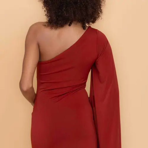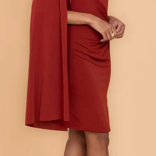 This mini dress defies convention like it was born to, with its asymmetrical cape sleeve draping boldly over the right shoulder, paired with an angled neckline that sharpens the profile. The skirt cuts in slightly to reveal the leg, while the mini length and burnt orange hue only amplify the charm of this dress. Dramatic and architectural, own the room in our cape sleeve mini dress.