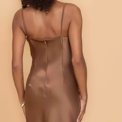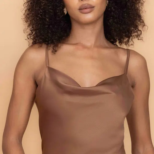 This cowl neck midi dress slinks along your silhouette in her velvety mocha, the satin soft to the gaze and even softer on the skin. The neckline of this dress drapes into a relaxed cowl, held by delicate straps. The waistline is shaped by darts in the back, with the skirt extending to a flattering midi dress length, the hem light and liquid, floating as you move. CARA is the perfect plus one to any occasion.