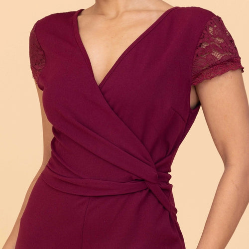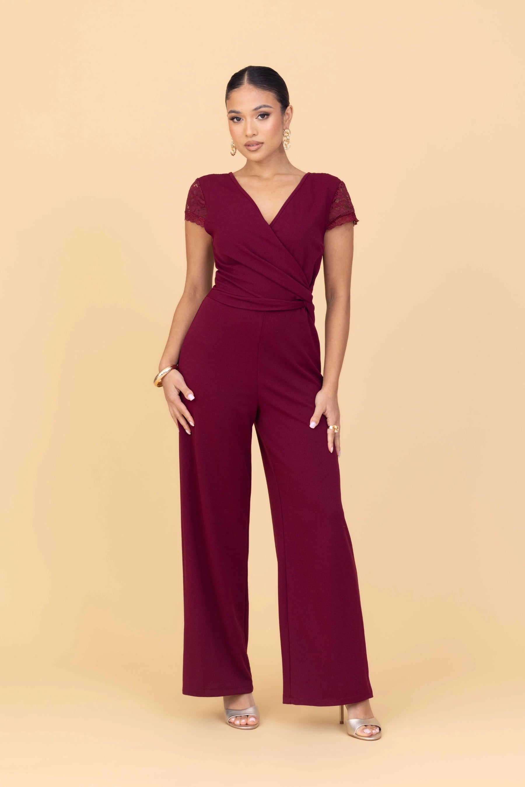 The CECILLIAN Wine Jumpsuit Petite delivers effortless sophistication in a rich merlot tone. A soft V‑neck wrap front shapes the bodice, while delicate lace sleeves introduce a touch of romance. The straight‑leg cut keeps the silhouette modern and easy to wear, giving the piece a relaxed elegance that works across seasons. Designed for versatility, it styles seamlessly with bold earrings when you want to elevate the look. From laid‑back afternoons to warm‑weather events, this jumpsuit offers comfort without compromising on polish—an easy go‑to for days when you want to look put‑together with minimal effort.