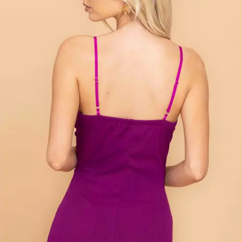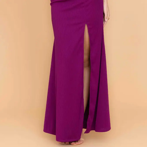 Meet CINDY, our plum maxi dress, who pulls focus with a deep V-neckline, framing the chest with a wrap cut. Thin spaghetti straps rest lightly above, outlining the shoulders delicately. Deep purple ruched fabric is gathered rhythmically across the bodice and waist before the skirt sweeps down, creating a bold split halfway up the thigh. This opening breathes movement into the dress, daring the wearer to make a dramatic entrance.