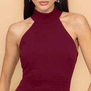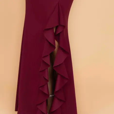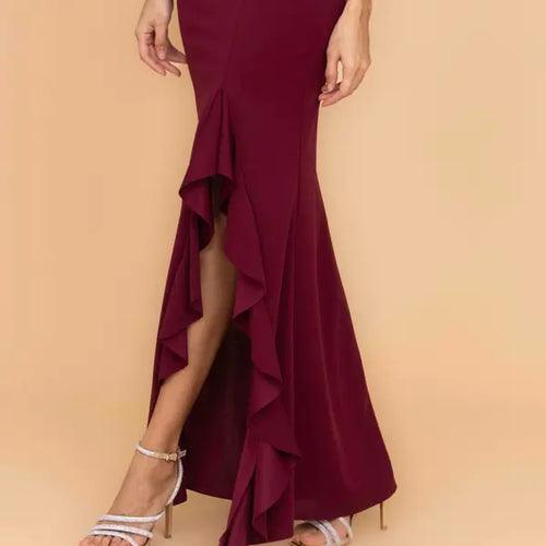 Define elegance in the CLAUDINE Wine Maxi Dress. The ultimate maxi dress for any upscale occasion, CLAUDINE exudes pure glamour. Whether she’s worn as a party dress or for a black tie gala, her deep wine hue, ruffle hem, split leg detail, and halterneck dress design will complement your figure like no other. Style our red halterneck maxi dress with a subtle pair of strappy heels and add statement earrings for a dash of glitz.