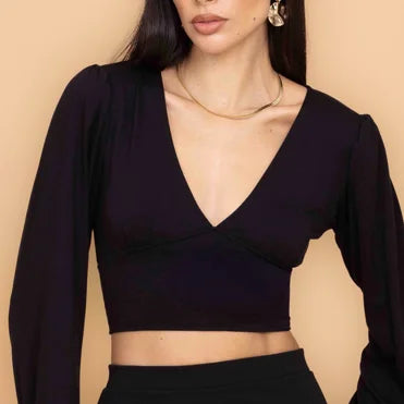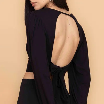 The CRISSY Black Long Sleeve Backless Top features loose, full-length sleeves that drape downward, covering the arms, while the front forms a plunging yet delicate V. Turn around, and the back is gone, open, bare, magnetic. In deep black, this is a top destined to be worn time and time again. A classic wardrobe staple, CRISSY is also available as a red backless long sleeve top for a more daring look, or opt for her as a green long sleeve backless top for subtle yet compelling color.