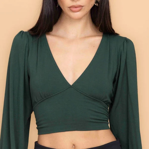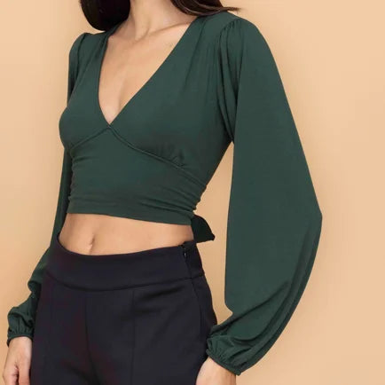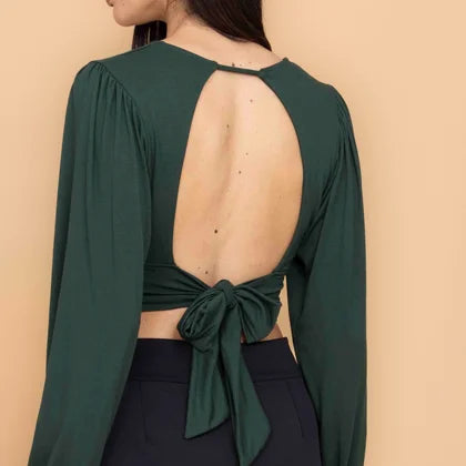 The CRISSY Forest Green Top offers a graceful silhouette, highlighted by a flattering deep V neckline. Its loose, flowing sleeves move softly with you, gently framing the arms and adding a touch of effortless elegance. The open back adds a subtle touch of allure, with the tie up bow allowing an adjustable fit. Light and fluid, this top drapes beautifully around the body, creating a sense of ease and quiet sophistication. Enjoy the CRISSY as a red backless long sleeve top for a more daring look, or opt for her as a black long sleeve backless top for understated glamor.