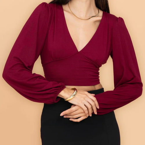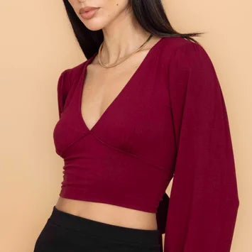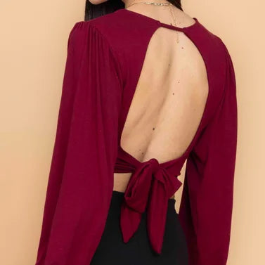 The CRISSY is a red backless long sleeve top that plays in opposites: full-length sleeves falling loose across the arms, while the neckline cuts into a deep plunge that tastefully reveals the décolletage. The back of this top is left entirely open, save for the bow, while the wine red hue offers a rich liquid color that goes with anything. Discover CRISSY as a green long sleeve backless top to complete your fall outfits collection, or opt for her as a black long sleeve backless top for understated glamor.
