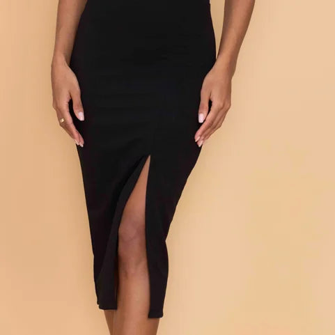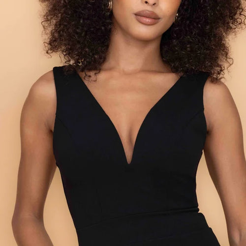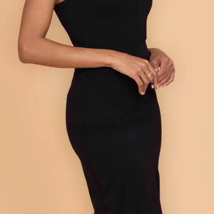 The ELOISE midi dress is all elegance. The wired V-neck plunges low, the bodice shaped by wide straps and a cinched waistband. The dress pulls in, following the shape of the body, with the skirt stopping just below the knee, cutting the leg clean with a bold slit to allow movement. There’s no excess in the shape of this black dress, where every line and edge serves a purpose; the silhouette emanating pure romance. For a rich splash of color, consider our green midi dress version of ELOISE.