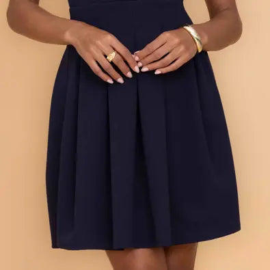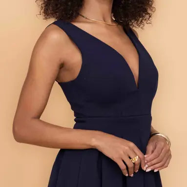 The ELOISE Navy Blue V-Neck Skater Dress is defined by its two-part neckline which starts shallow near the shoulders before plunging into a deep V. Thick straps frame the bodice, anchoring this mini dress and giving it solidity against the flowing movement of the pleated skirt. The skater hem lifts and billows, its playfulness set against the richness of dark navy, an almost oceanic deep blue. For a touch of spice, consider ELOISE in her red V-neck skater dress variant.
