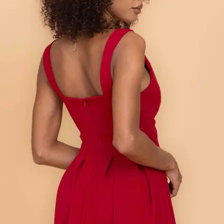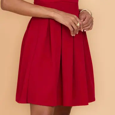 Paint the town red wearing ELOISE, a vibrant combination of playful charm and chic allure. The plunge v neckline adds glamour to the red v-neck skater dress and is paired with a curved waistband, which cinches the figure. The pleated skater skirt is created for movement, and the short hemline lengthens the silhouette. Designed in a rich scarlet colour, this mini dress can speak for itself; style it with minimal accessories and glamorous hair. Also available in a rich navy blue colour.