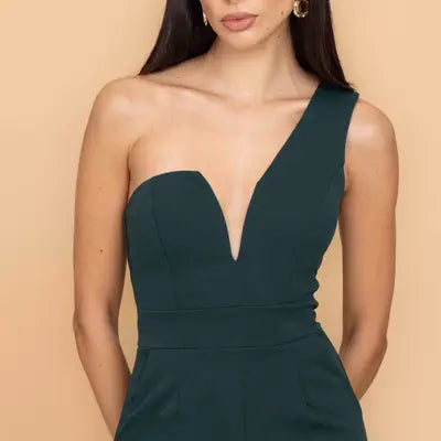 The FLEUR Emerald Green Jumpsuit combines structure with softness. A strapless sweetheart neckline with one shoulder to make sure it stays in place all night, this green jumpsuit features a cinched waist and wide-leg pants to create an hourglass silhouette. Designed in a rich jewel tone, our emerald green one-shoulder jumpsuit speaks for itself. Keep accessories minimal with an elegant updo to let the piece shine.