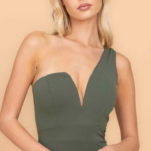 GIGI, our dark khaki green one-shoulder midi dress, exudes grace and sophistication with a playful edge. With an asymmetrical neckline, v-neck plunge, and knee-length skirt, this midi dress perfectly balances timeless elegance with contemporary style. The bodice is cinched at the waist, enhancing the silhouette, with a daring slit climbing the thigh. Also available as a navy or electric blue one-shoulder midi dress, GIGI is best worn with gold heels, matching jewellery, and a sleek hairstyle.