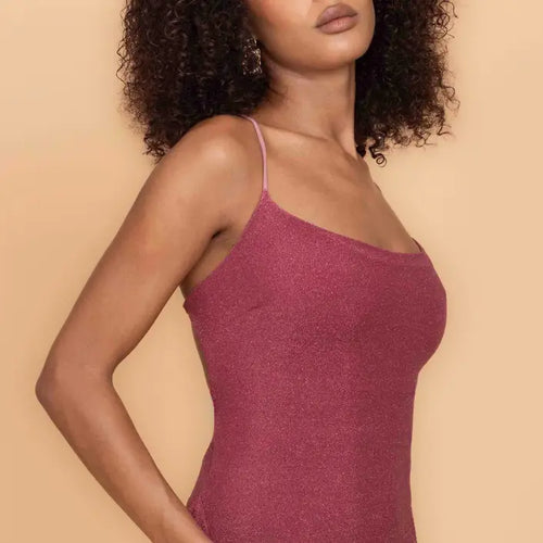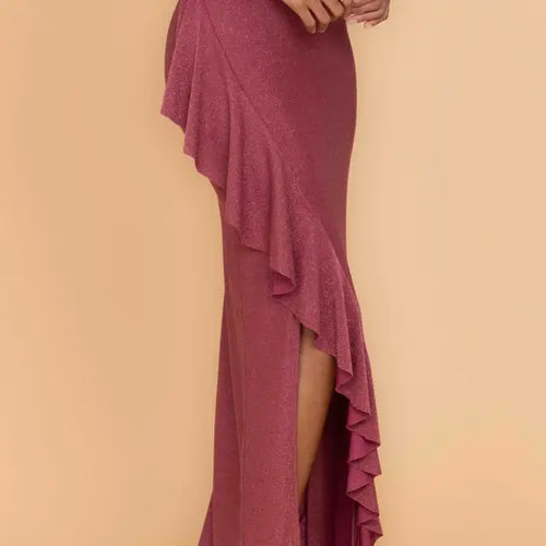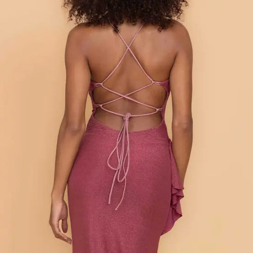 The GRACE Rose Pink Maxi Dress features fabric that catches light like liquid stardust, shimmering as you turn. This maxi dress clings to the body, every curve defined beneath a sparkling surface that ripples with crushed and scattered diamonds. The wrap effect dress skims across the body, gently ruffling from the hip, a soft wave that falls down, bringing a sense of movement even in stillness. The back is open, outlined by straps that tie in place. For a shock of rich color, consider GRACE in her electric blue glitter maxi dress form.