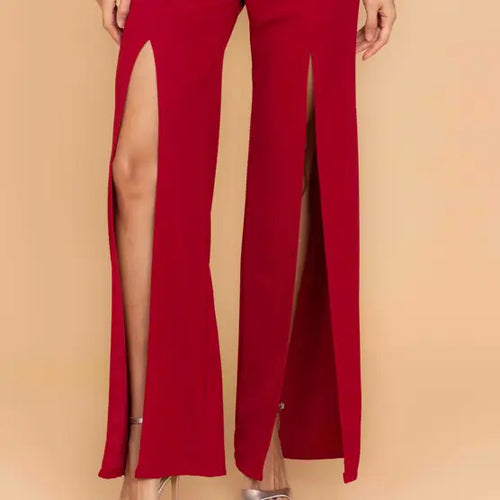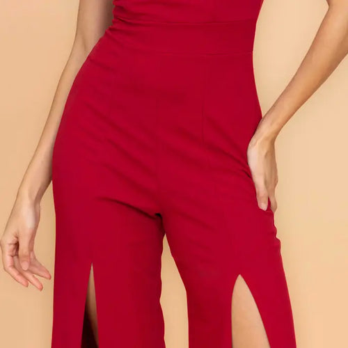Our LANEY Scarlet Jumpsuit is a vision in red, designed for unforgettable entrances. Striking the balance between refined and dramatic, the strapless bodice of this jumpsuit makes the perfect canvas for your favorite necklace with a plunge V neck that’s wired to hold its shape, while the flared pants each feature thigh slits to flatter the leg and showcase your heels underneath. Our red strapless jumpsuit pairs well with candlelit dinners, late-night cocktail hours, and glamorous hair.