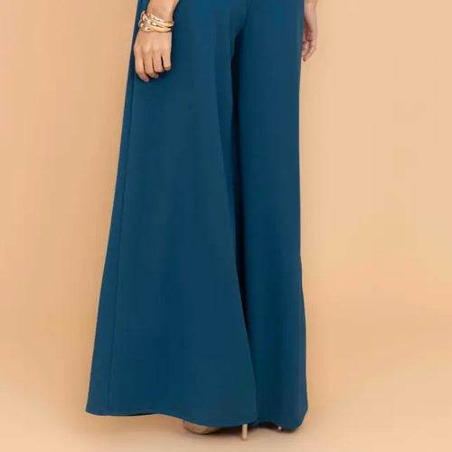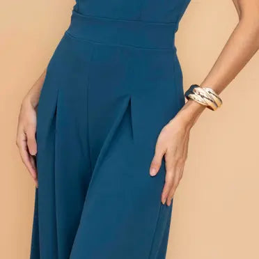 Stand tall in the LEILA Dark Teal Blue Jumpsuit as she frames the body with a halterneck and sweeping legs in deep, jewel-toned teal. The bodice sits tightly against the waist before flaring out into wide-leg pants, creating an hourglass silhouette. The color recalls dark waters at night, with dark teal blue giving this sophisticated jumpsuit a sense of cool solidity. Also available as a khaki wide-leg jumpsuit.