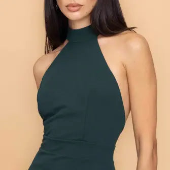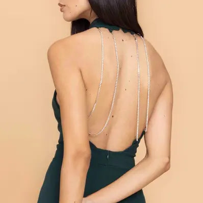Cut a statuesque figure in this dazzling forest green diamante maxi dress. LEILA oozes red carpet glamour, pairing a body-skimming shape with razor-sharp design details. A sculptural fabric collar frames the neckline, while the clean, straight-cut skirt brings a sense of sleek control to the silhouette. The backless finish and diamanté accents add a flash of drama, making this open back dress a scene-stealer from every angle.