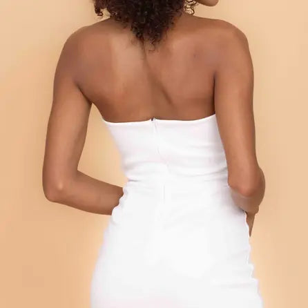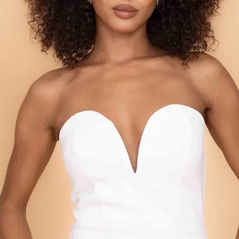 The LOLA is our mermaid midi dress crafted in a luxe structured white fabric that traces the body closely from neckline to knee. The strapless bodice has rounded cups that plunge into a deep V, leaving the shoulders uncovered and elongating the line of the dress. Below the knee, the skirt of this V-neck dress releases into layered ruffles that ripple outward, giving the hem a fishtail curve that moves like water when walking. From aisle to afterparty, LOLA is ready to shine, wherever you wear her.
