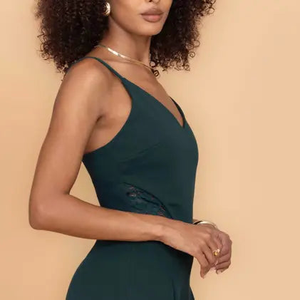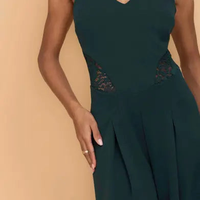 This LYDIA is a jumpsuit crafted to exude timeless elegance with a contemporary edge. The bodice is cinched, with delicate sheer lace panels at the waist and a V neckline that sweeps above the bust. Flared pants billow at the ankle to create a silhouette that moves with you. Designed in a rich forest green color, this green lace jumpsuit is made for those extra special occasions. Style with dainty gold jewelry and sparkly heels.
