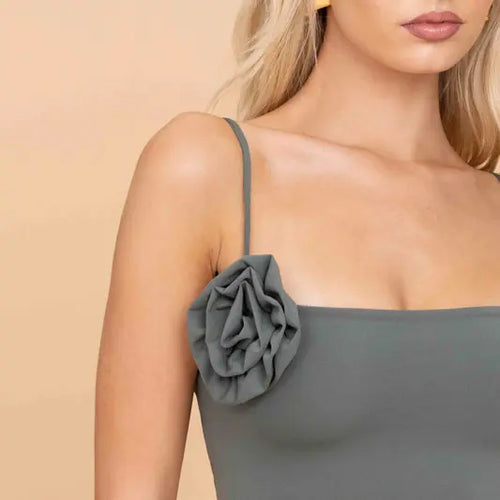 Allure meets elegance with MARY, an indispensable piece for unforgettable date nights and formal gatherings. A bodycon silhouette skims and flatters every curve, with ruching at the back helping the fabric to contour to the body. The maxi dress hemline lengthens the frame and a ruffled flower detail adds a touch of romance to the silhouette. Tie-back cami straps elevate this khaki maxi dress and she is paired perfectly with slicked-back hair and gold jewelry. Love MARY? She’s also available as a blue tie back dress or burnt orange maxi dress with tie back.