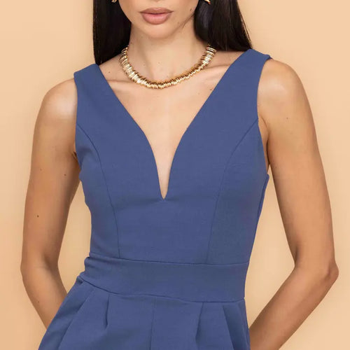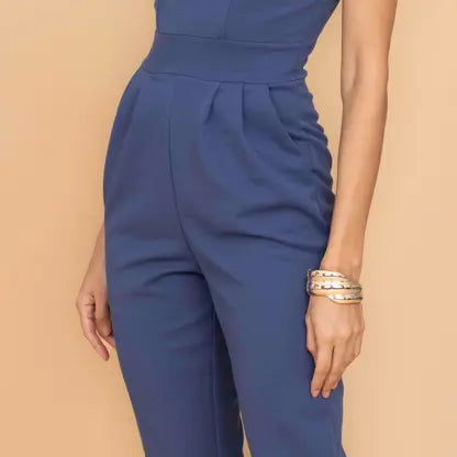 This indigo blue sleeveless jumpsuit is pared back but says enough with its color and shape. A plunging neckline cuts low between its thick shoulder straps, drawing the eye down the central line of the bodice. The waist pulls in, and the hips are framed close, the legs kept lean to the body. The character of this jumpsuit rests in its color, a classic blue denim hue. For a brighter shade of blue, consider the OLIVIA in her electric blue jumpsuit with v neck form or opt for our dark brown sleeveless jumpsuit version.