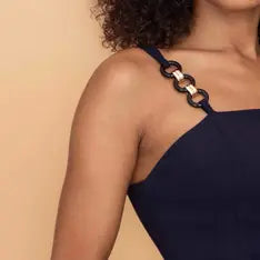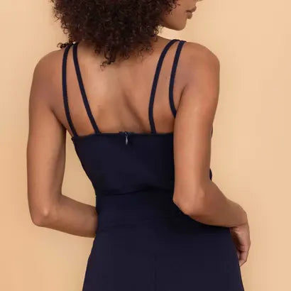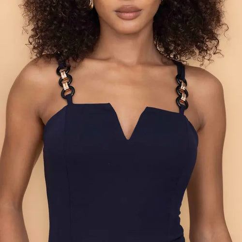 Our RUE Navy Mini Dress perfectly blends timeless formalwear with a contemporary edge. Short cut and figure-hugging to trace a slimming silhouette, this mini dress features a V-notch neckline to create a tasteful décolleté. Held up by black and gold chain straps, RUE is designed for cocktail receptions and fine dining. Pair our chain strap mini dress with matching navy court heels and gold jewelry.