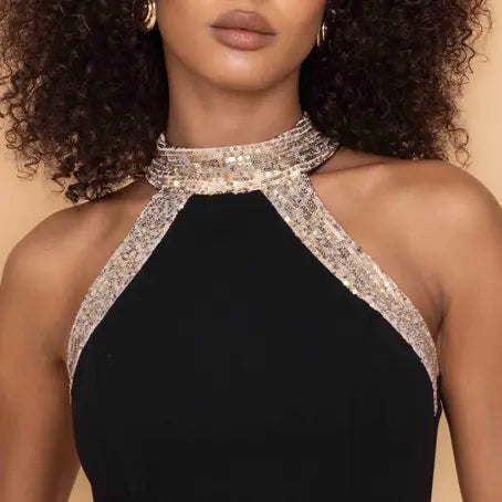 Set the sparkle bar high this season in the SABRINA Black Mini Dress with Gold Sequins. Featuring an unmissable luxe gold sequin halter neck with keyhole back detail, we simply can’t get enough of her. With the mini dress length, subtle slit detail in the skirt, and ultra-flattering fit, this little black dress is a guaranteed head turner at your next event.