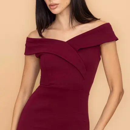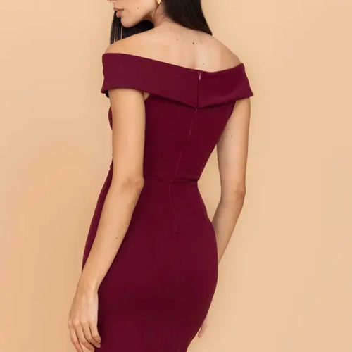 ZARA is our red off-the-shoulder midi dress defined by a folded neckline that opens outward in a soft V, sweeping below the collarbone. From there, the fabric of this midi dress clings close, tracing the body with unbroken lines that fall to just below the knee. Its rich red wine tone deepens the effect, turning this fitted silhouette into something charged and regal. Change the tone and consider our green off-shoulder midi dress version of ZARA.